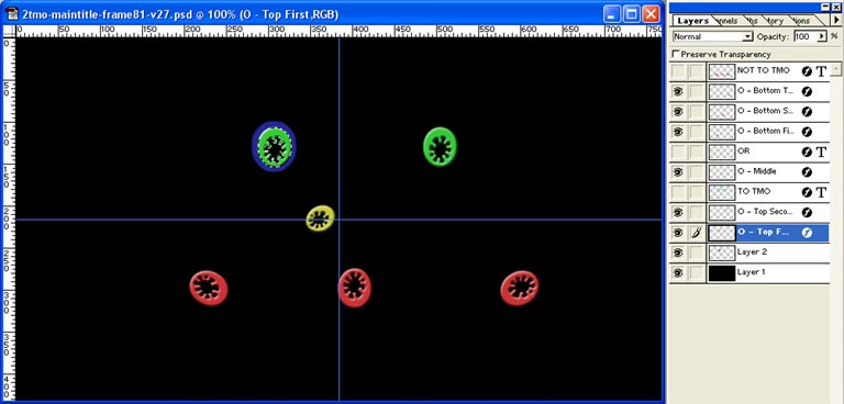 The opening and closing "To TMO or Not To TMO" title, with the letter O's that spin, was done frame-by-frame in Adobe Photoshop. I first used "guides" to get the text centered and spaced properly on the canvas. Then I added the letter O's as their own layers and positioned them on top of the corresponding O's in the title. Once this base image was ready, I created a copy for each frame of animation.