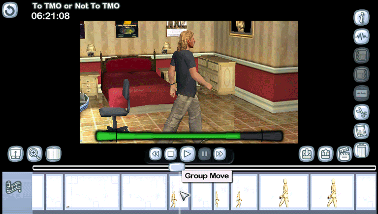 In the end, what I had were three game scenes for each of the two transitions. The first transition used the "Group Move" scene on my "Empty Space" set. In the Post Production screen, this looked like: Group Move -> scene with full-screen animated overlay -> Group Move. So, I filmed the Group Move scene with the bedroom as set dressing. Then, I copied that scene and redressed the second shot with the casting office, sidewalks, and other ornaments. The camera angle remained the same on both shots.